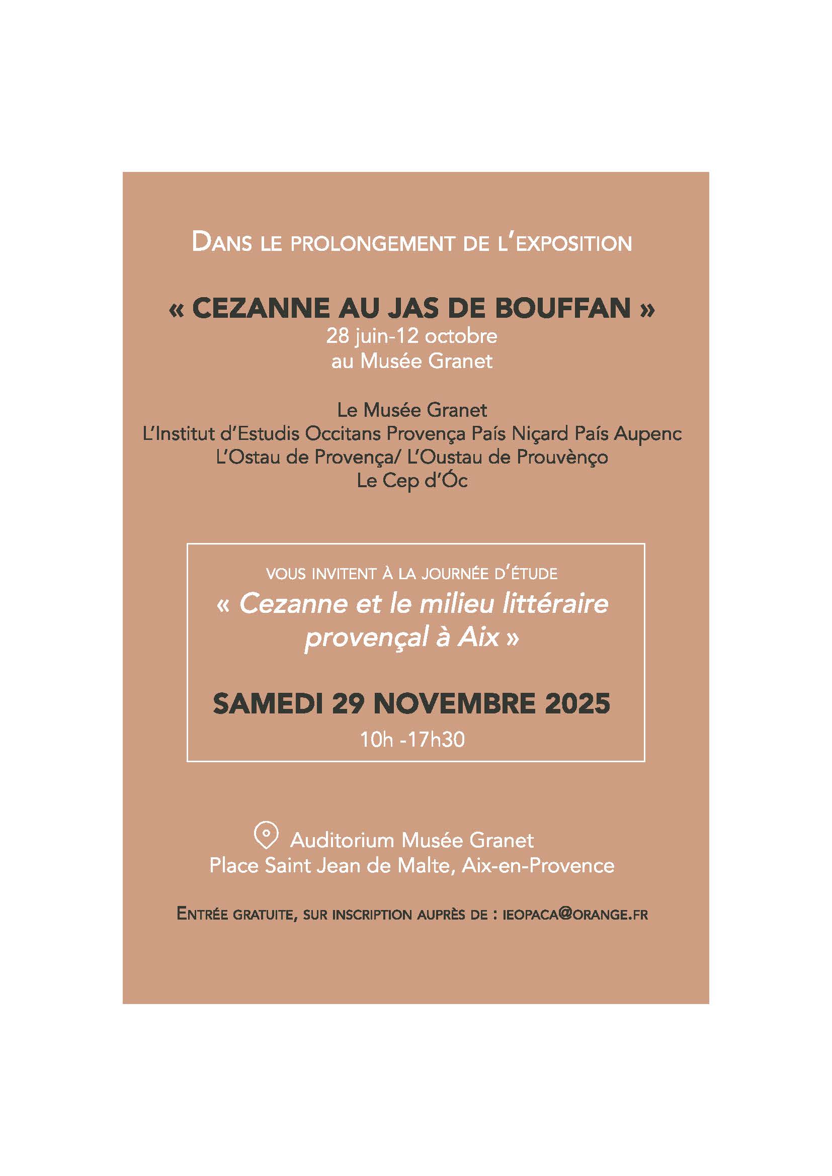 En seguida de l’exposicion »Cezanne au Jas de Bouffan » (28 de junh au 12 d’octòbre au Musèu Granet), lo Musèu Granet, l’Institut d’Estudis Occitans Provença País niçard País Aupenc, l’Ostau de Provença e lo Cep d’Òc vos convidan a la jornada d’estudi «Cezanne e lo mitan literari provençau as Ais», lo dissabte 29 de novembre venent de 10h a 17h30 a l’Auditòrium Musèu Granet, Plaça Sant Joan de Malta as Ais de Provença.